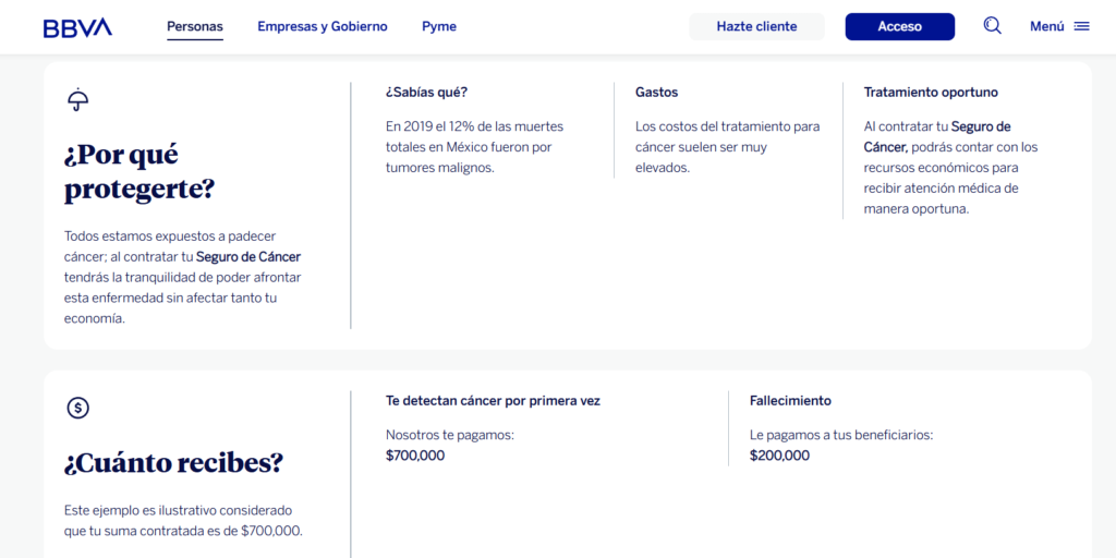 • Se puede contratar desde 100 pesos al mes, (de acuerdo con información del sitio oficial de BBVA), sin embargo, señala que el precio puede variar dependiendo de tu edad y el paquete de contratación que elijas.