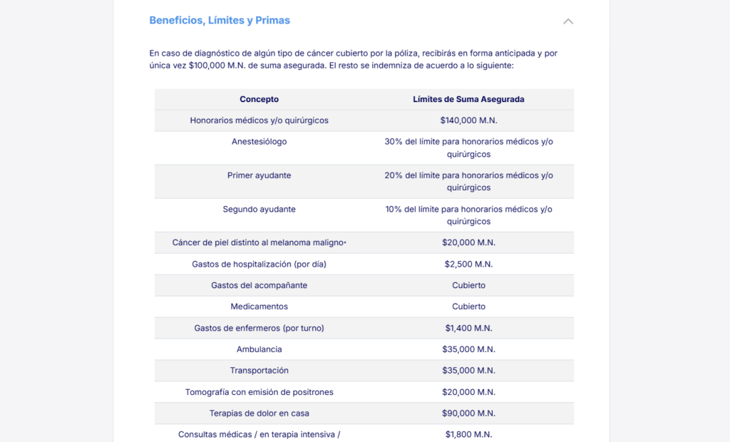 • Este producto ampara al asegurador con un plan que cubre gastos por la atención médica hospitalaria y gastos funerarios derivados de padecer cáncer. Cuenta con una cobertura de gastos médicos por cáncer con una suma asegurada de $1,000,000 MN.