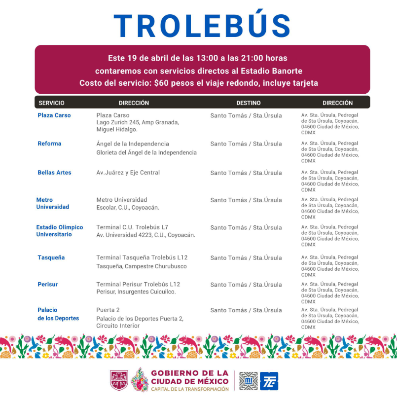 Las unidades partirán desde distintos puntos estratégicos de la capital, entre ellos Plaza Carso, Reforma (a la altura del Ángel de la Independencia), Bellas Artes, Metro Universidad, Estadio Olímpico Universitario, Tasqueña, Perisur y el Palacio de los Deportes, lo que permitirá a los asistentes elegir la opción más cercana a su ubicación.