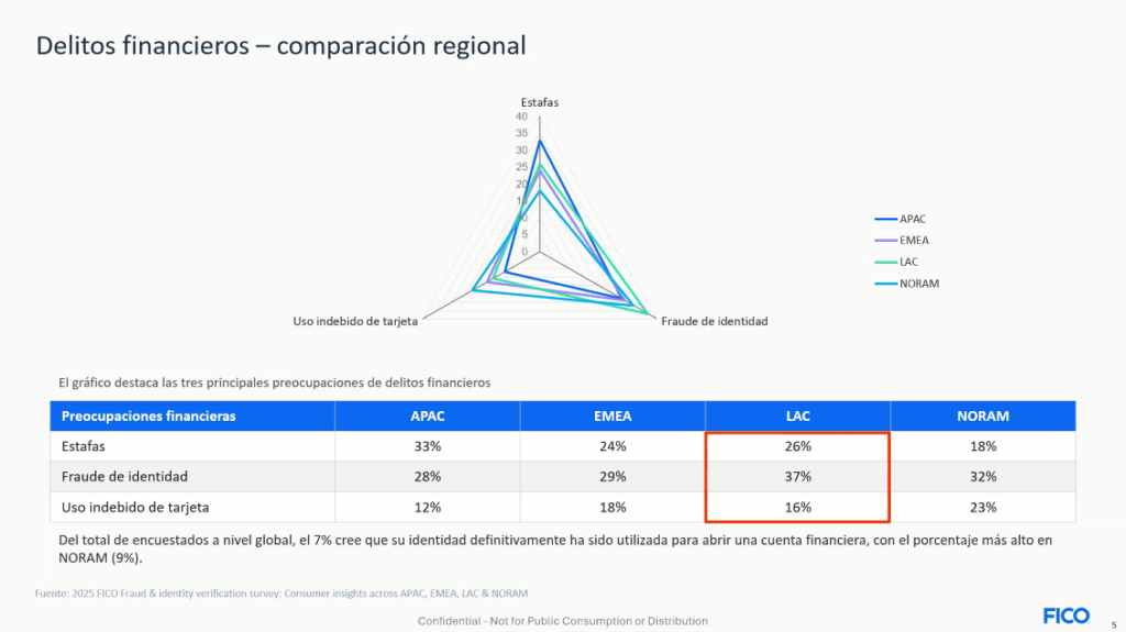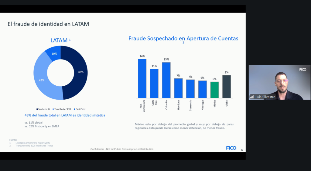 El fraude de identidad en América Latina está dominado por esquemas cada vez más sofisticados, de acuerdo con FICO, 48% del fraude total en la región corresponde a identidad sintética, muy por encima de otras modalidades como el fraude de terceros (42%) y el de primera parte (10%).