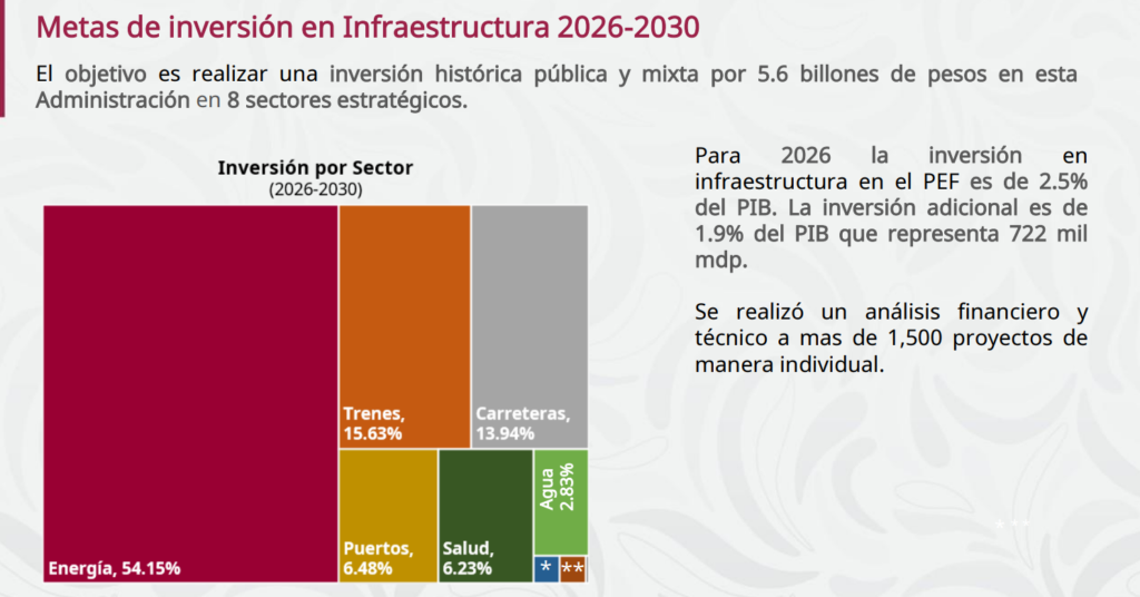 Del total de recursos, 54% se destinará al sector energético, consolidando la apuesta por la soberanía energética; 16% a trenes, 14% a carreteras, 6% a puertos y 6% a salud, mientras que agua (3%) y educación (3.4%) recibirán recursos adicionales. En conjunto, la inversión adicional representará 1.9% del PIB, equivalente a 722 mil millones de pesos, por encima del gasto en infraestructura contemplado en el PEF 2026.