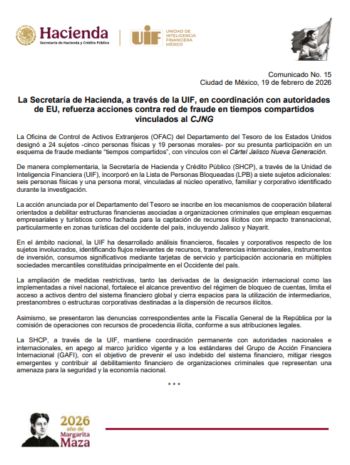 La Secretaría de Hacienda, a través de la Unidad de Inteligencia Financiera (UIF), reforzó el combate a esquemas de fraude vinculados al turismo y al crimen organizado al incorporar a siete personas adicionales en la Lista de Personas Bloquedas, en coordinación con autoridades de Estados Unidos.