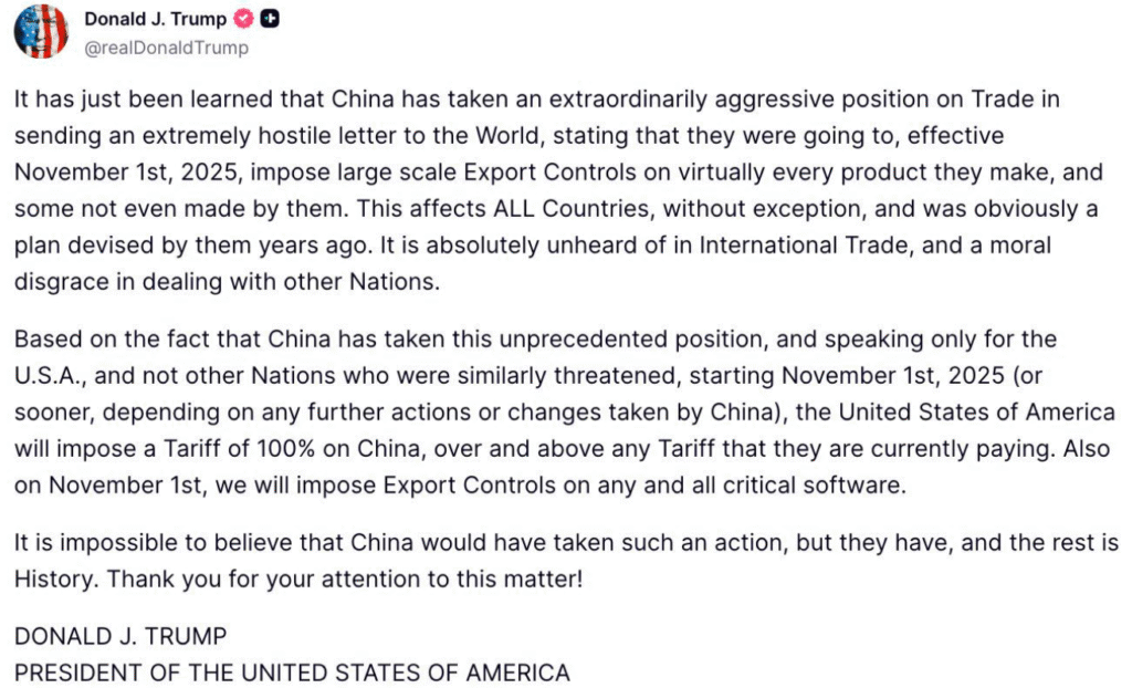 En un mensaje difundido desde su cuenta oficial, Trump acusó a Pekín de adoptar una postura comercial “extraordinariamente hostil”, tras conocerse que el gobierno chino planea imponer controles masivos a la exportación de prácticamente todos los productos que fabrica, incluidos algunos desarrollados fuera de su territorio.