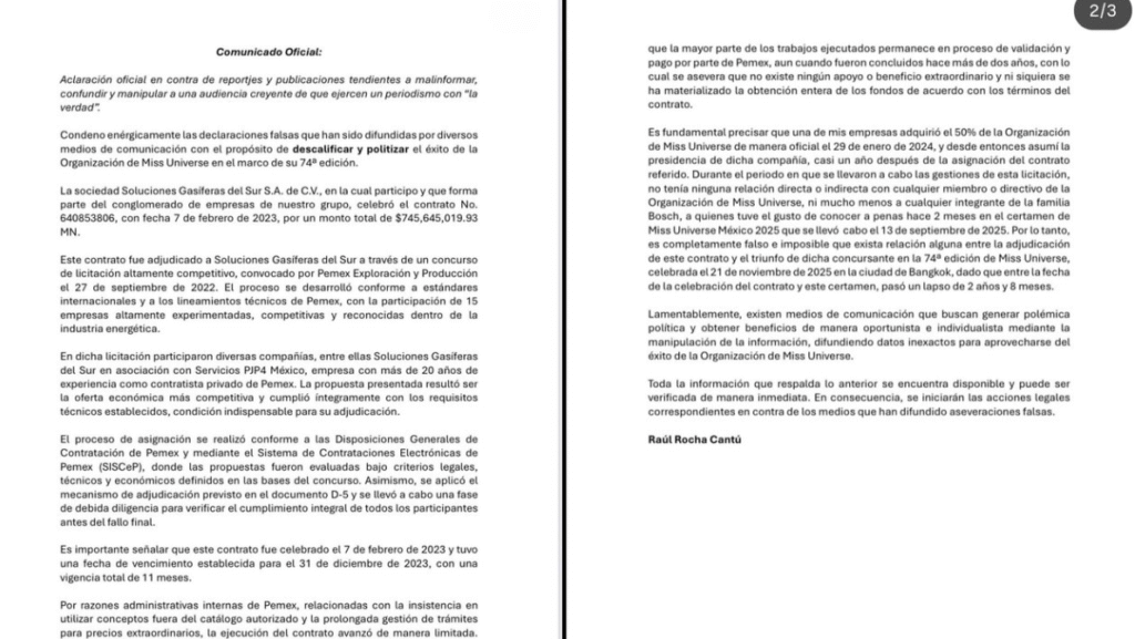 Tras la controversia generada luego del triunfo de Fátima Bosch en Miss Universo 2025 y las acusaciones sobre una presunta intervención de Pemex en el certamen, el empresario Raúl Rocha Cantú, presidente de la Organización Miss Universe, salió a aclarar públicamente el origen y los detalles del contrato por 745.6 millones de pesos adjudicado a una de sus empresas.