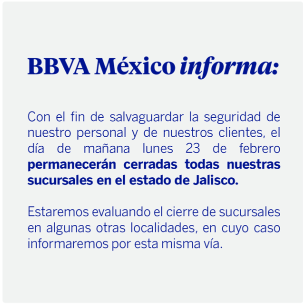 Por su parte, BBVA México anunció el cierre de todas sus sucursales en el estado de Jalisco durante la jornada, mientras evalúa la situación en otras localidades, y recomendó a sus clientes utilizar la banca móvil y en línea.