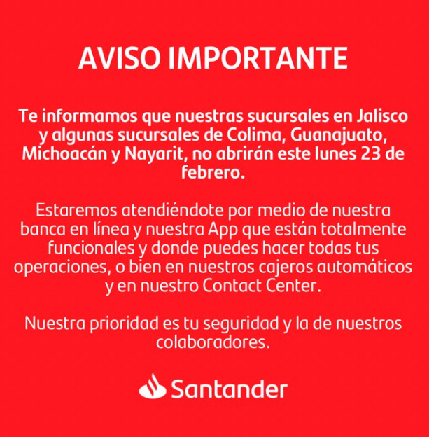 A través de avisos difundidos en sus canales oficiales, Banco Santander informó que este lunes 23 de febrero no abrirán sus sucursales en Jalisco, así como algunas oficinas en Colima, Guanajuato, Michoacán y Nayarit.