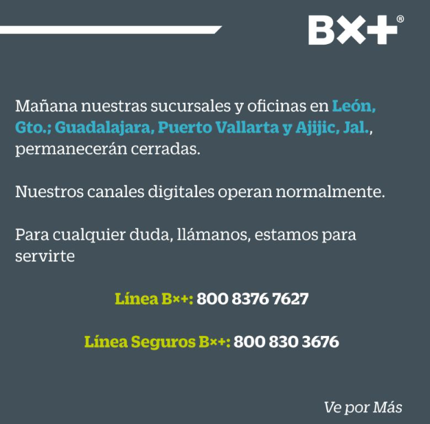 En tanto, Banco Ve por Más (Bx+) informó que sus sucursales y oficinas en León, Guanajuato; Guadalajara y Puerto Vallarta, Jalisco; así como Ajijic, permanecerán cerradas temporalmente. La institución señaló que sus canales digitales funcionan con normalidad y puso a disposición líneas telefónicas de atención.