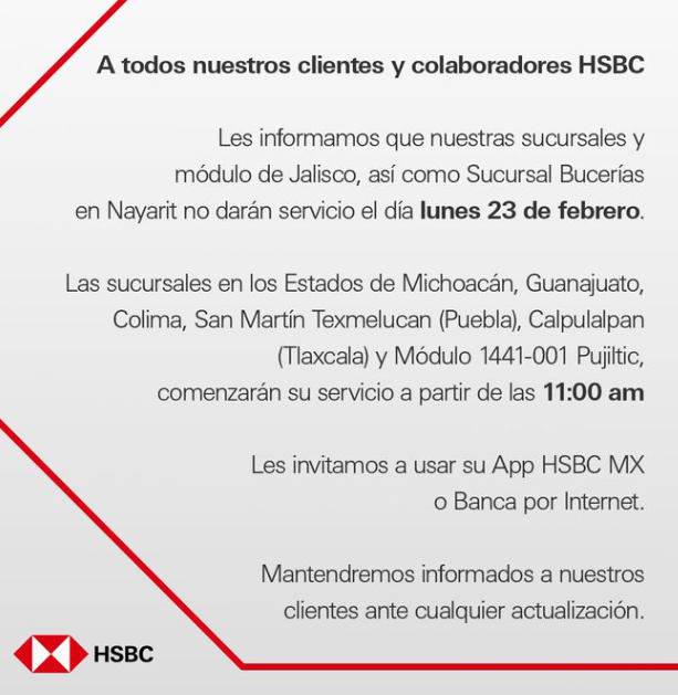 Asimismo, HSBC México comunicó que sus sucursales y módulos en Jalisco, así como la sucursal Bucerías en Nayarit, no brindarán servicio el lunes 23 de febrero.