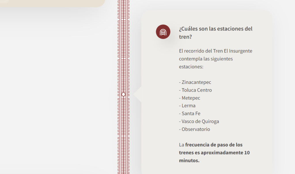 El Tren Interurbano El Insurgente recorre siete estaciones: Zinacantepec, Toluca Centro, Metepec, Lerma, Santa Fe, Vasco de Quiroga y Observatorio. El acceso se realiza principalmente con la Tarjeta de Movilidad Integrada, personal e intransferible, aunque también se pueden comprar boletos en módulos dentro de cada estación.